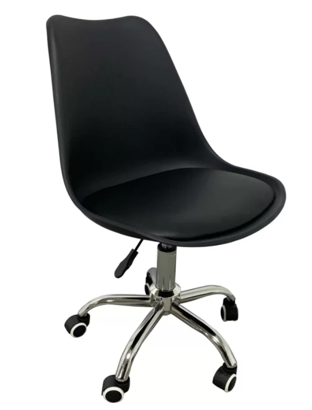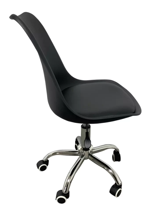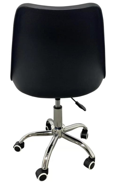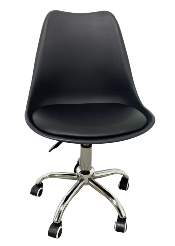 Material: Assento em polipropileno e couro ecológico (PU). Base Cromada com altura regulável. Rodízio em Nylon.